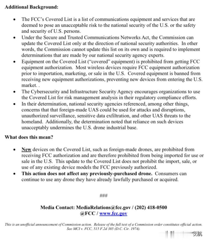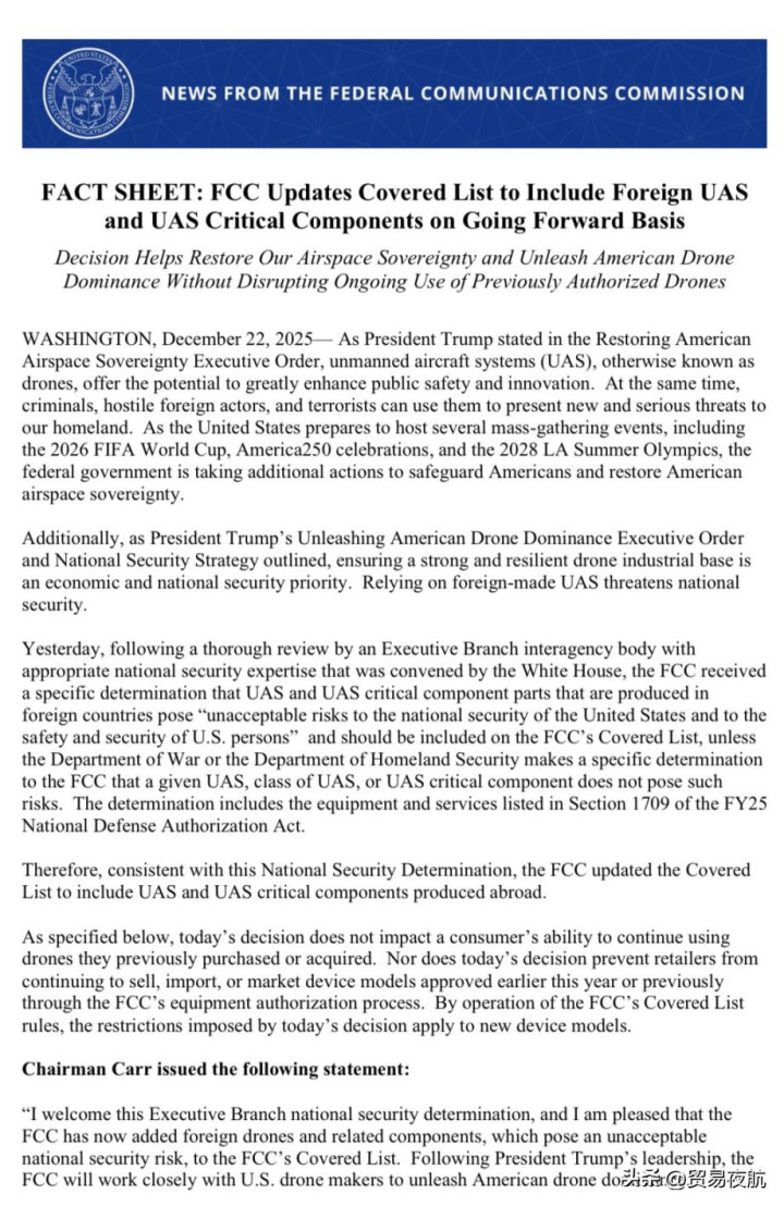 字据好意思国联邦通讯委员会(FCC)于2025年12月22日发布的最新公告,FCC 已崇敬更新其“袒护清单”(Covered List),将中国大疆(DJI)、谈通(Autel)等悉数异邦坐褥的无东谈主驾驶飞机系统(Uncrewed Aircraft Systems, UAS,即无东谈主机系统)偏执关节组件纳入对好意思国国度安全组成不成罗致风险的企业清单,并将不容批准在好意思国入口或销售悉数新式号无东谈主机及关节组件。